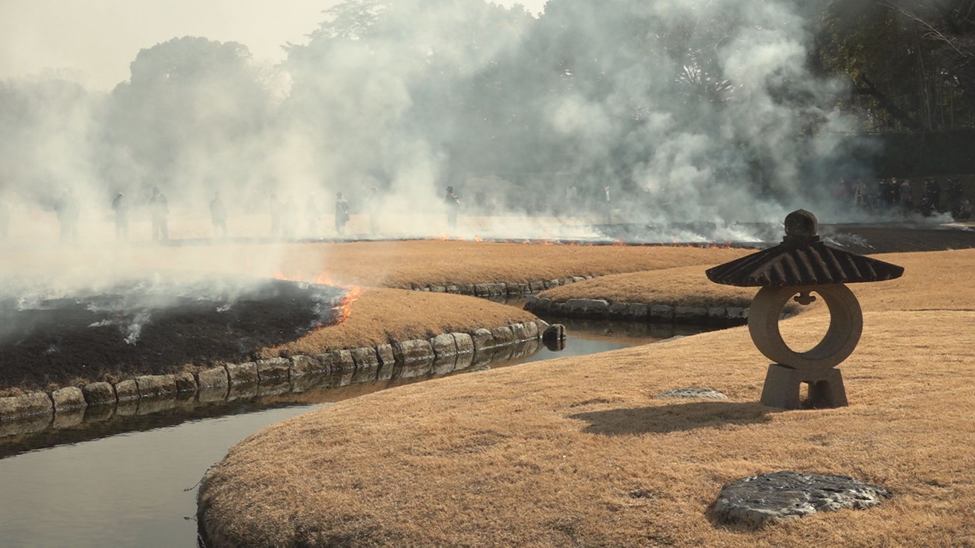立春の4日、岡山後楽園で早春の恒例行事「芝焼き」が行われました。冬枯れの芝生が真…