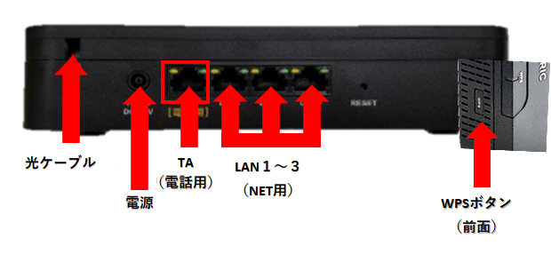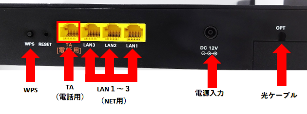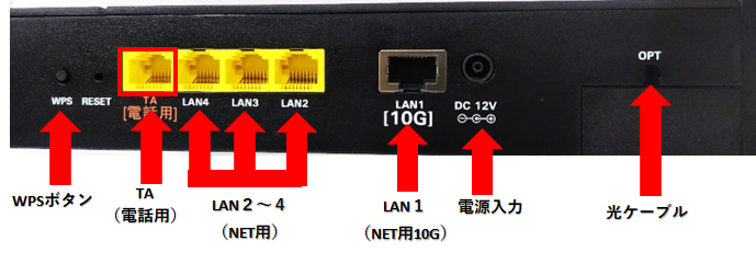 | TA (電話用) | 【ご注意ください】(赤枠)のTAは電話用モデム 「HGW」or「WMTA」専用ポートとなります。 |